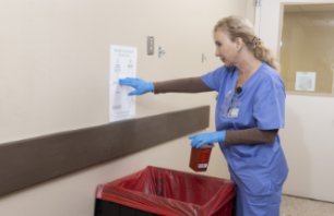 Solution: Human Resources and people leaders can support their employees by providing a sharps waste disposal method in the office, rather than allowing employees to use the regular trash. SafeDropTM sharps disposal options are part of Stericycle's Safe Community Solutions, which help our customers protect the communities they serve. Stericycle offers sharps containers in various sizes, securely mountable to workplace restroom walls, helping to prevent needlestick injuries by encouraging staff not to dispose of sharps in the regular trash.